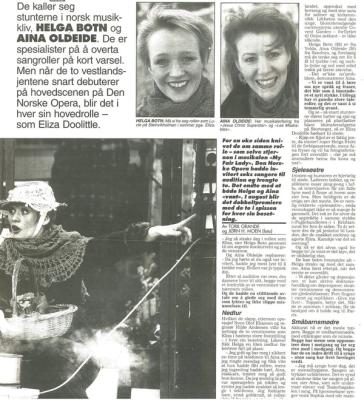 Jesus Christ Superstar (29. mar 1990 - Det Norske Teatret) - Skuespiller (Maria Magdalena)Jenta mi (14. feb 1989 - Oslo Nye Teater) - Skuespiller (Byfuggel´n / Fru Løwenbrau - alternerte med Askeland)Les Misérables (17. mar 1988 - Det Norske Teatret) - Skuespiller (Hore / Tigger + understudy for Fantine)Keisar og galilear (19. sep 1987 - Det Norske Teatret) - Skuespiller (Diverse roller)Spelemann på taket (21. mar 1987 - Det Norske Teatret) - Skuespiller (Frauma Sara, første kona til Laisar Wolf)