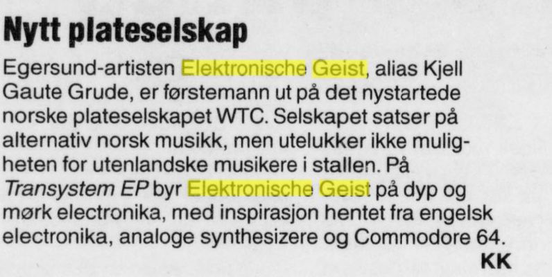 Elektronische Geist signerte på plateselskapet WTC. Her ga Grude ut EP-en «Transystem» i 2000. Musikken ble beskrevet som dyp og mørk elektronika, inspirert av den engelske elektronisk musikkscenen, analoge synthesizere og Commodore 64.