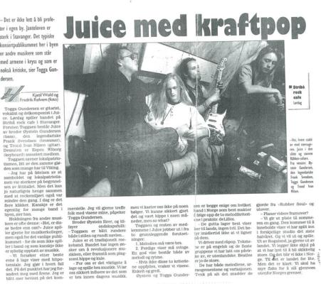 Med Juice platedebuterte Togga Gundersen med eget band. Han hadde tidligere spilt gitar på andre gruppers utgivelser. Musikalsk sett bevegde Juice seg fra det melodiske og relativt snille, til det bråkete og kaotiske.
