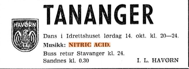 Gjennombrudd/høydepunkterNitric Acid var Rogalands svar på Blind Faith og Cream, og ble etablert i det første hippieåret - 1967. I denne perioden begynte det å danne seg et skille i musikklivet mellom de rene dansebandene og de som hadde lyst å presentere ny og spennende musikk.