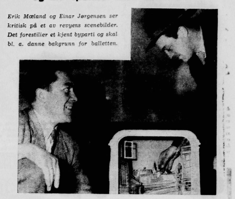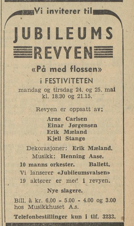 Hovedgruppen bak revyen til Haugesunds by -jubileum, «På med flossen» , var Erik Mæland, Einar Jørgensen, Arne Carlsen, Kjell Stange. Melodiene var komponert av orkesterleder Henning Aase. Hovedforfattere var K. Stange og Harald Tørring. Andre bidragsytere var Asbjørn Udstuen, Knut Berg, E. Jørgensen. E. Mæland sto for de imponerende dekorasjonene.Besetningen besto av 19 medvirkende, deriblant flere kvinner. Alle var fra byen, og revyen var ett hundre prosents Haugesundsprodukt. Begivenheten foregikk på Festiviteten.