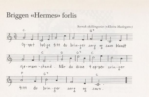 Det er ikke kjent hvem som har skrevet teksten til visa om «Hermes» sitt endelikt. Sangens siste strofer hinter til at det var sønnen til en av de omkomne som diktet den. Dette var mest trolig et salgstriks. Melodien er tatt fra den svenske folkevisa «Elvira Madegan».