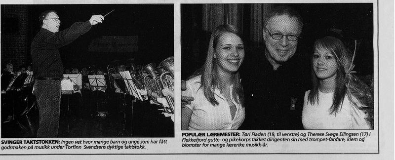 Torfinn hadde selv bakgrunn fra brassbevegelsen i Stavanger. Da datteren ble med i Flekkefjord pikekorps, ble han etter hvert engasjert her som gruppeinstruktør.